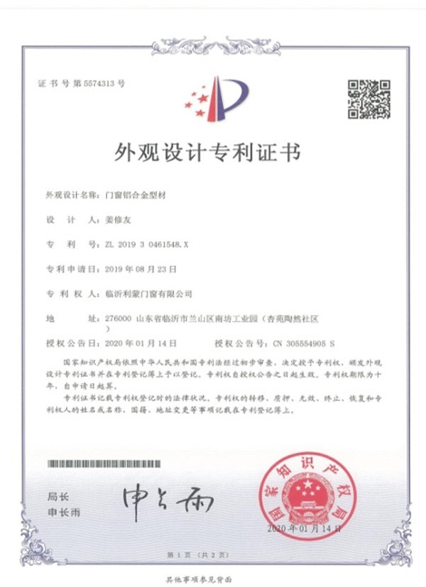 • Design Patent - Aluminum Alloy Profile for Doors and Windows